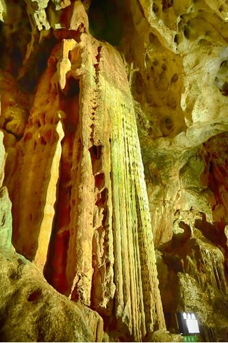 正面入口→青天井→長淵→百枚皿→洞内富士→千町田→千畳敷…と、秋芳洞を進んできました。秋芳洞の正面入口から約650mすすんだところに、黄金柱と呼ばれる巨大な石灰岩の柱が立っています。仰ぎ見るほどの巨大さに圧倒されます。黄金柱は巨大なうえに、表面には細…