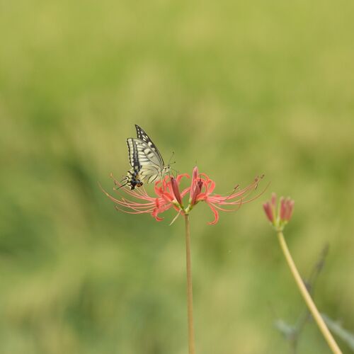 2016年9月25日の日曜の朝、11時半に撮った写真です。 秋の訪れを告げる彼岸花。優雅なアゲハ蝶が舞いおりる、美しい一瞬でした。