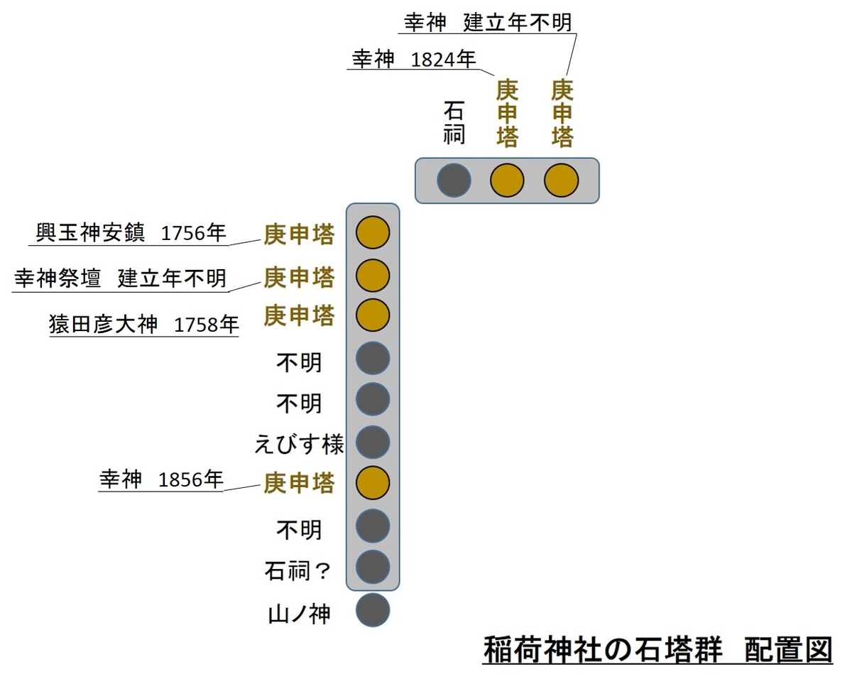 これまでは逆L字の長い縦棒のほうの庚申塔をご紹介してきました。上図だと下側から上側にむかって、ひとつずつ順にご紹介してきました。