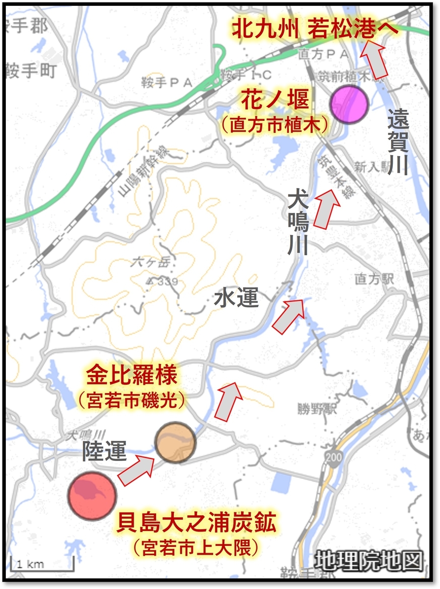 遠賀川の支流が犬鳴川です。遠賀川流域で石炭の採掘がはじまったのは1700年ごろ。このあたり「磯光」という地区で採掘された石炭は、荷車で犬鳴川まで運ばれ、犬鳴川から遠賀川経由で、船によって現・北九州方面まで運ばれたと考えられます。