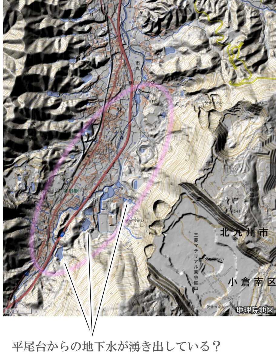 平尾台を囲うようにV字型の断層がはしっていることがわかりました。断層を境界として、低くなっている側の場所には、他にも湧水があることが考えられます。地形図をみてみると、大清水神社や石灰採掘場より南側にある地域にも多くの溜池がみられます。もしかしたら、これらの地域にも湧水があるのかもしれません。